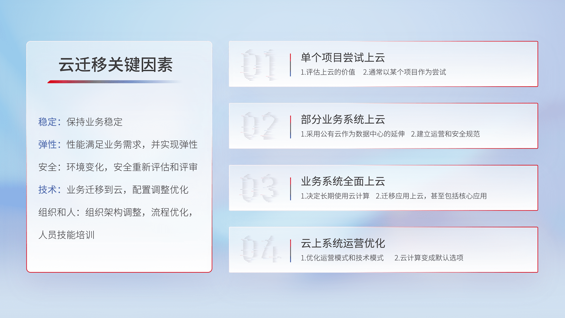 结合实际业务,,从规划设计、、、、云平台选型、、云原生改造、、数据迁移、、、、集成交付,,,迁移全过程为客户识别最佳上云路径,,,做好风险识别管理,,设计网络架构、、身份权限、、、、安全审计合规、、、操作审计、、日志审计、、监控告警策略、、、多站点容灾设计等,,对云上基础设施进行整体规划,,,,提升IT治理水平,,,以满足弹性、、、、高可用、、高性能的需求。。