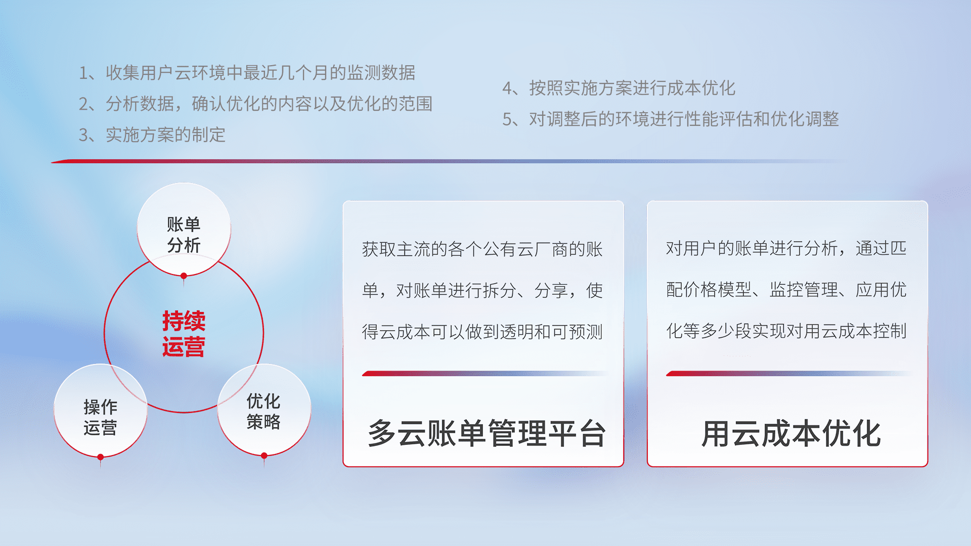 通过多云纳管,,,以统一的资源数据模型把客户的云资源进行抽象和封装,,进而实现对多云资源的统一操作,,保障云资源管理的可靠性、、稳定性与可用性。。。量身定制化运维内容,,,配置、、、开发运维、、、、补丁管理、、、、备份、、监控、、认证和访问管理、、、审计和日常巡检等,,,,保障在用云过程中的可靠度,,,稳定度以及高可用率。。。。